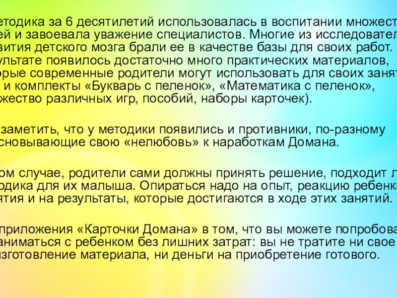 Плюс приложения «Карточки Домана» в том, что вы можете попробовать позаниматься с ребенком без лишних затрат: вы не тратите ни свое время на изготовление материала, ни деньги на приобретение готового.