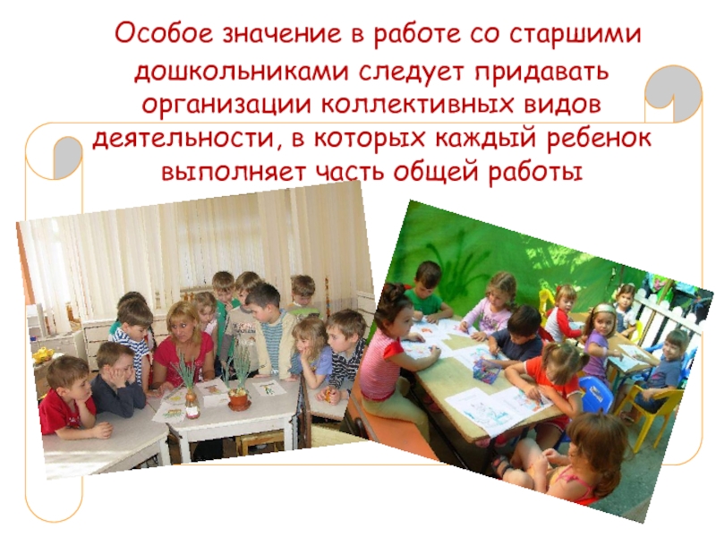 Особое значение в работе со старшими дошкольниками следует придавать организации коллективных видов деятельности, в которых каждый