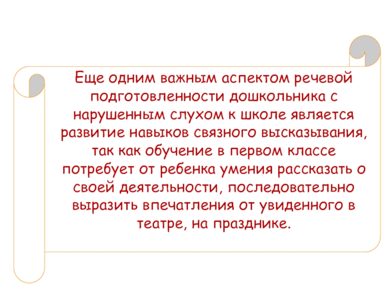 Слайд 19Еще одним важным аспектом речевой подготовленности дошкольника с нарушенным слухом к
