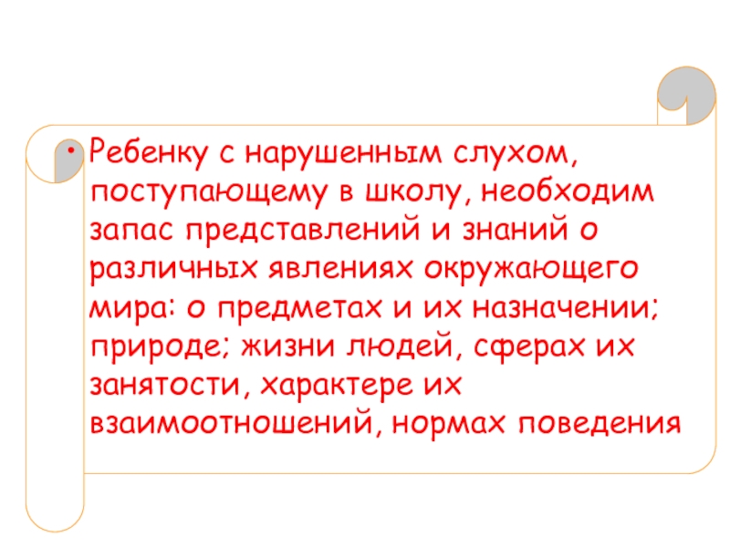 Ребенку с нарушенным слухом, поступающему в школу, необходим запас представлений и знаний о различных явлениях окружающего мира: