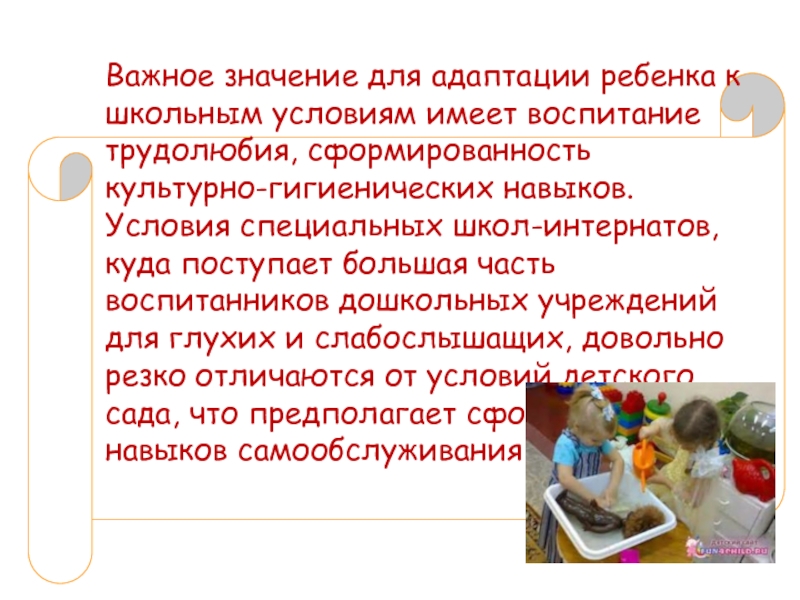 сформированность культурно-гигиенических навыков. Условия специальных школ-интернатов, куда поступает большая часть воспитанников дошкольных учреждений для глухих и слабослышащих, довольно резко отличаются от условий детского сада, что предполагает сформированность навыков самообслуживания