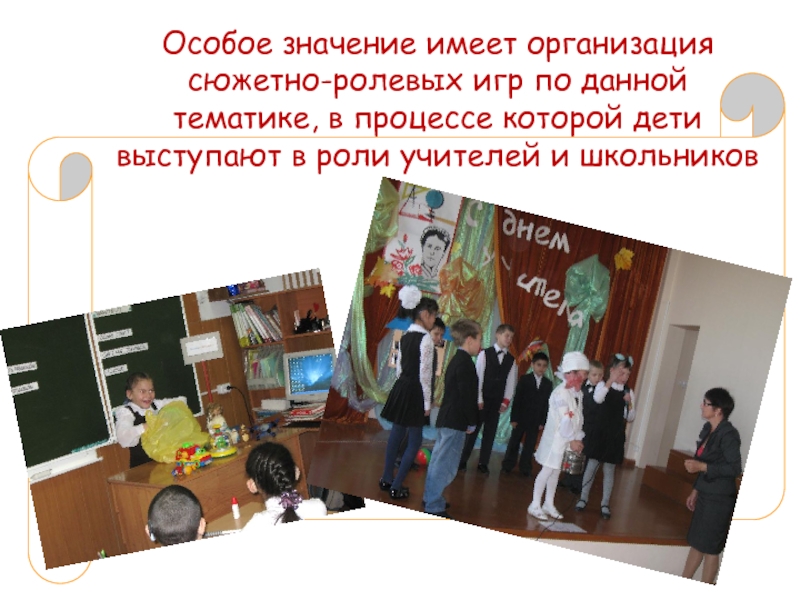 Особое значение имеет организация сюжетно-ролевых игр по данной тематике, в процессе которой дети выступают в роли учителей