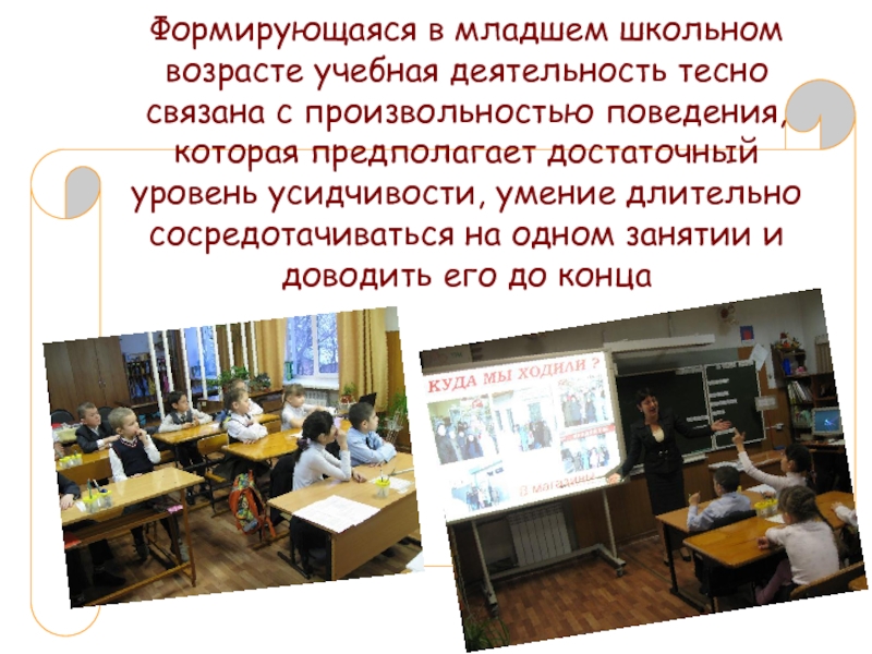 Формирующаяся в младшем школьном возрасте учебная деятельность тесно связана с произвольностью поведения, которая предполагает достаточный уровень усидчивости,