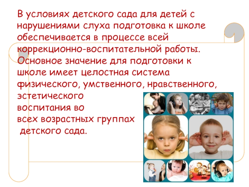 Слайд 7В условиях детского сада для детей с нарушениями слуха подготовка к