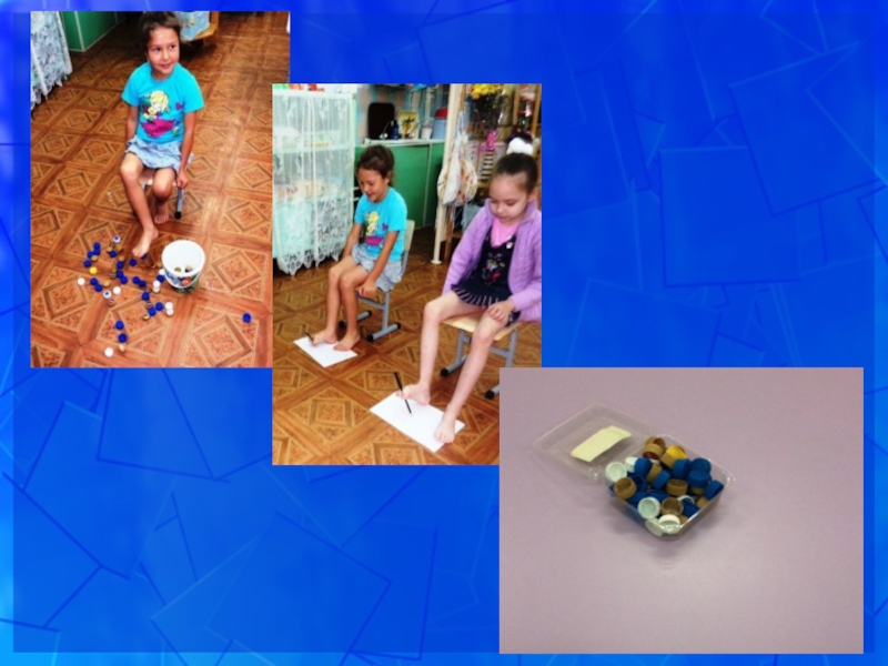 Задание: собирание крышек пальцами ног или перекладывание из одной ёмкости в другую; рисование цветными карандашами на листах бумаги; катание и захватывание цилиндров стопами.