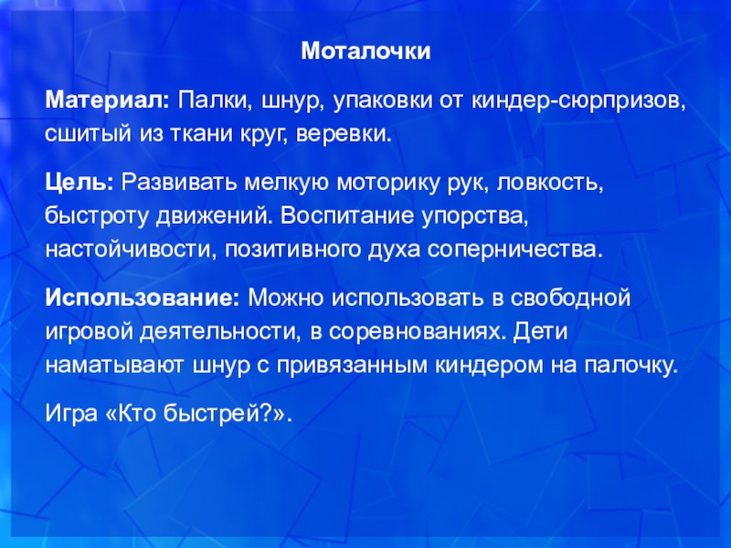 Использование: Можно использовать в свободной игровой деятельности, в соревнованиях. Дети наматывают шнур с привязанным киндером на палочку.