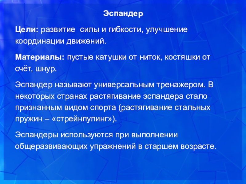 Эспандер называют универсальным тренажером. В некоторых странах растягивание эспандера стало признанным видом спорта (растягивание стальных пружин – «стрейнпулинг»).