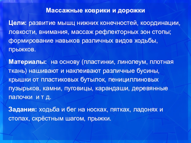 массаж рефлекторных зон стопы; формирование навыков различных видов ходьбы, прыжков.