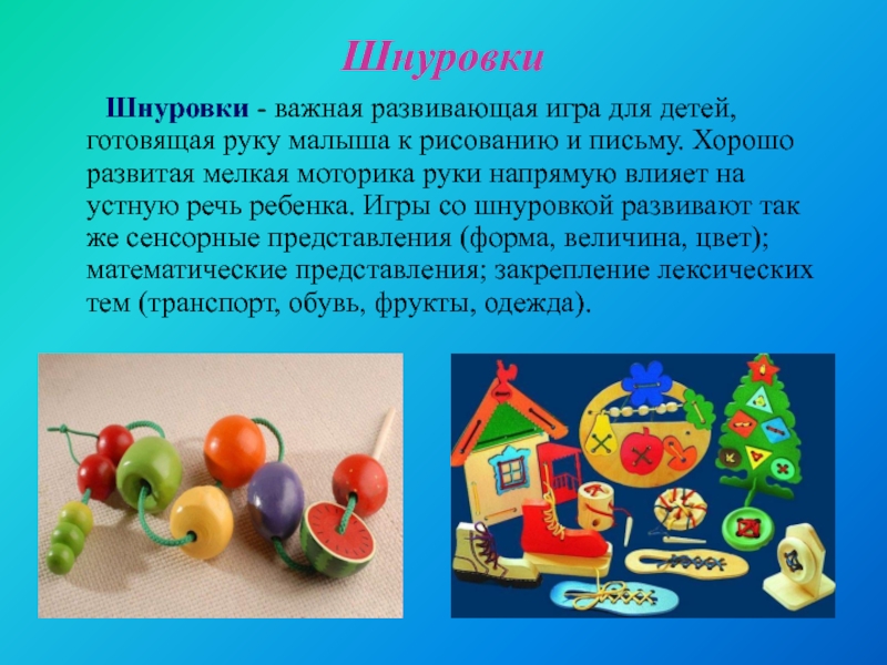готовящая руку малыша к рисованию и письму. Хорошо развитая мелкая моторика руки напрямую влияет на устную речь ребенка. Игры со шнуровкой развивают так же сенсорные представления (форма, величина, цвет); математические представления; закрепление лексических тем (транспорт, обувь, фрукты, одежда).