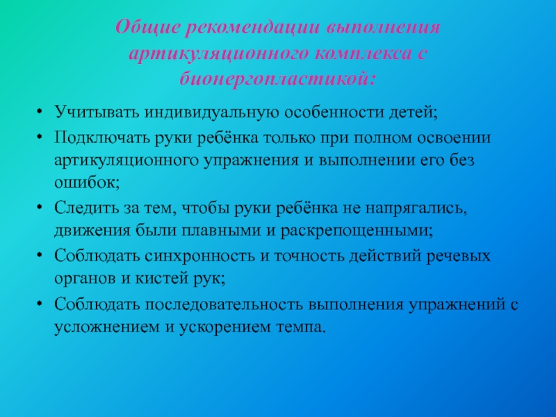 Слайд 8Общие рекомендации выполнения артикуляционного комплекса с бионергопластикой:
