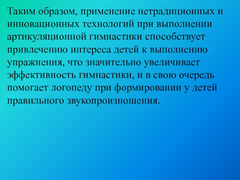 Слайд 22Таким образом, применение нетрадиционных и инновационных технологий при выполнении артикуляционной гимнастики