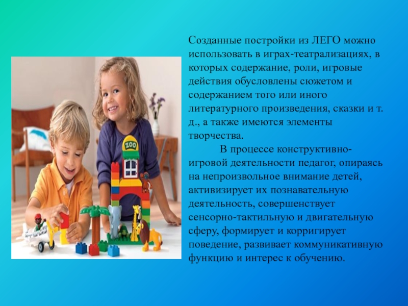 Слайд 19Созданные постройки из ЛЕГО можно использовать в играх-театрализациях, в которых содержание,