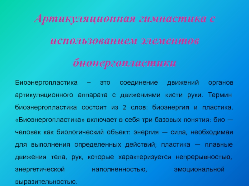 органов артикуляционного аппарата с движениями кисти руки. Термин биоэнергопластика состоит из 2 слов: биоэнергия и пластика. «Биоэнергопластика» включает в себя три базовых понятия: био — человек как биологический объект: энергия — сила, необходимая для выполнения определенных действий; пластика — плавные движения тела, рук, которые характеризуется непрерывностью, энергетической наполненностью, эмоциональной выразительностью.