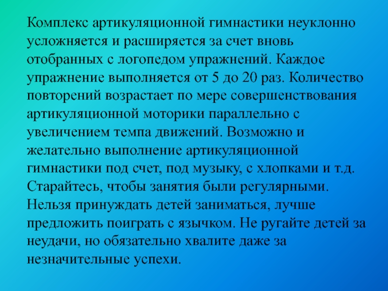 Слайд 6Комплекс артикуляционной гимнастики неуклонно усложняется и расширяется за счет вновь отобранных