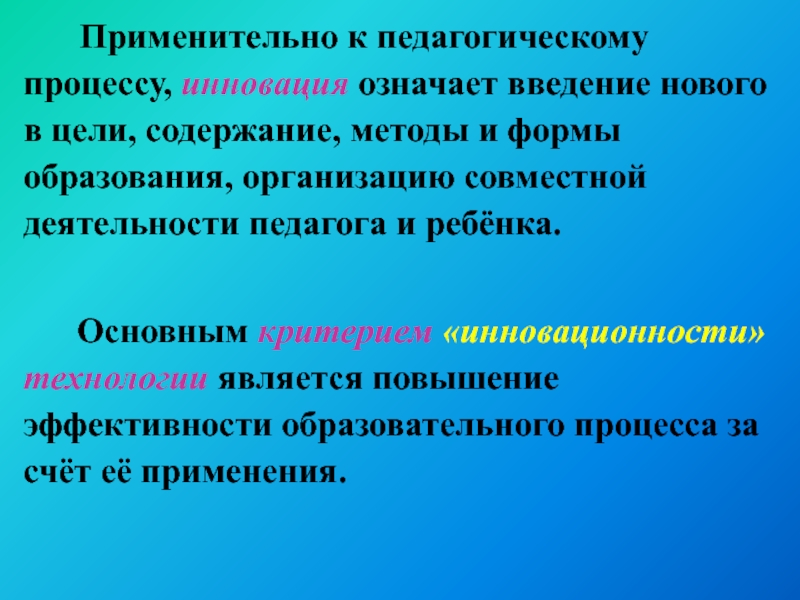 Слайд 3 Применительно к педагогическому процессу, инновация означает введение