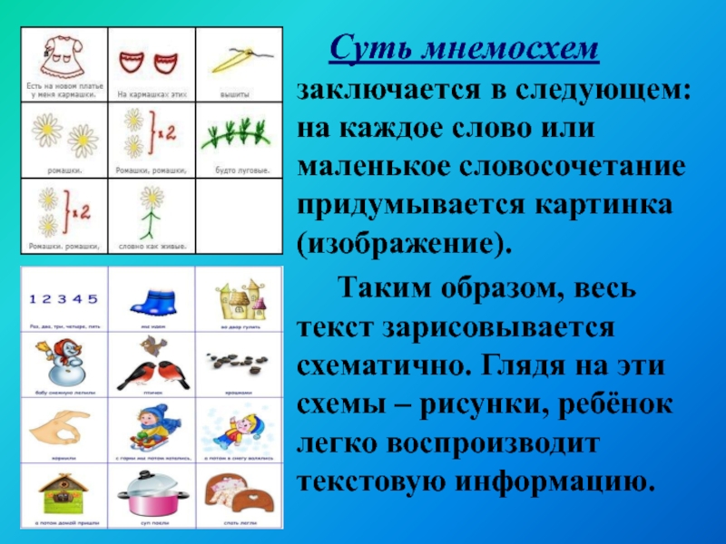 Слайд 14 Суть мнемосхем заключается в следующем: на каждое слово или