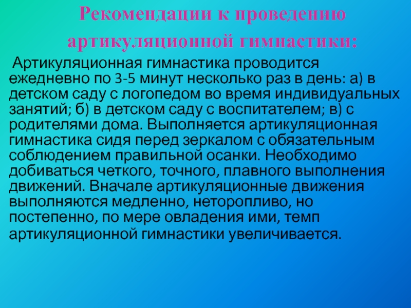Слайд 5Рекомендации к проведению артикуляционной гимнастики: