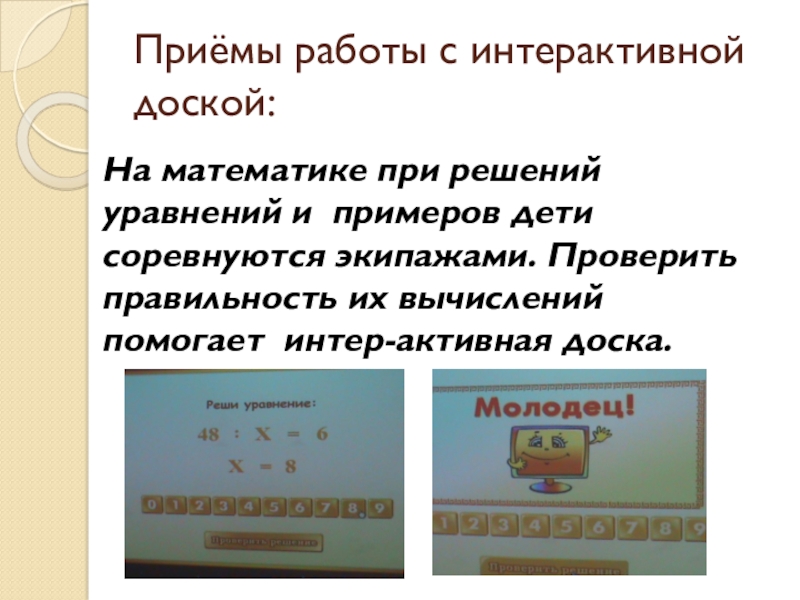 дети соревнуются экипажами. Проверить правильность их вычислений помогает интер-активная доска.