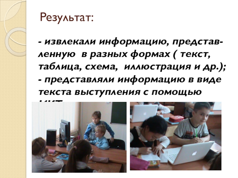 - представляли информацию в виде текста выступления с помощью ИКТ.