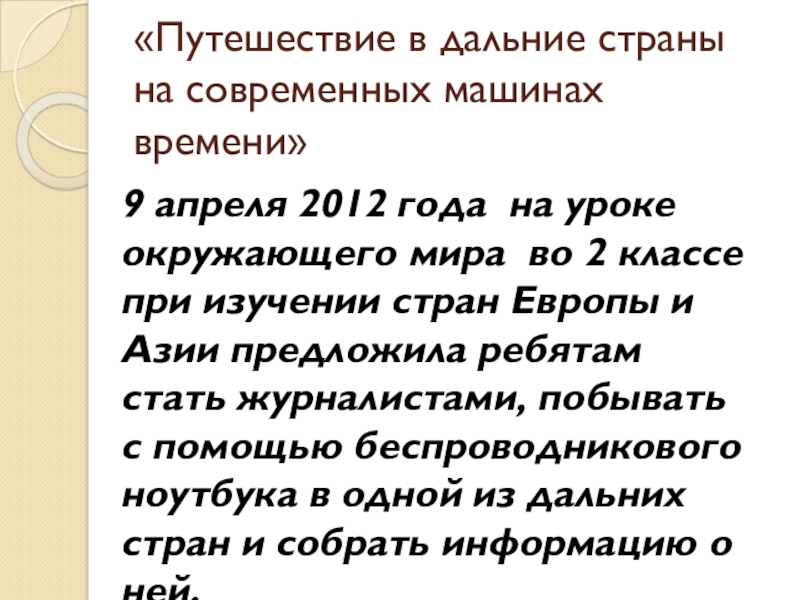 при изучении стран Европы и Азии предложила ребятам стать журналистами, побывать с помощью беспроводникового ноутбука в одной из дальних стран и собрать информацию о ней.