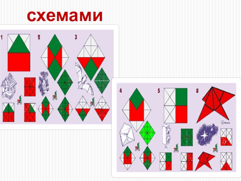 -это 32 жестких треугольника наклеены на гибкую основу с двух сторон. Квадрат легко трансформируется, позволяя конструировать плоскостные и объемные фигуры. Дети осваивают алгоритм конструирования находят спрятанные в "домике" геометрические фигуры, придумывают собственные предметные силуэты.