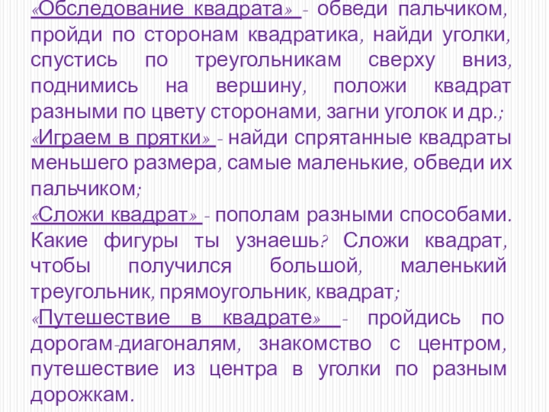 «Обследование квадрата» - обведи пальчиком, пройди по сторонам квадратика, найди уголки, спустись по треугольникам сверху вниз, поднимись на вершину, положи квадрат разными по цвету сторонами, загни уголок и др.;