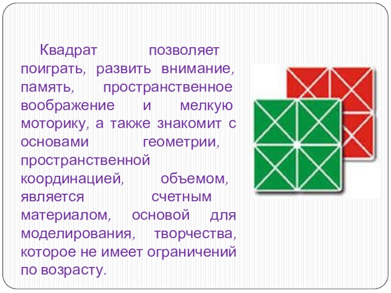 Слайд 14Квадрат позволяет поиграть, развить внимание, память, пространственное воображение и мелкую моторику,