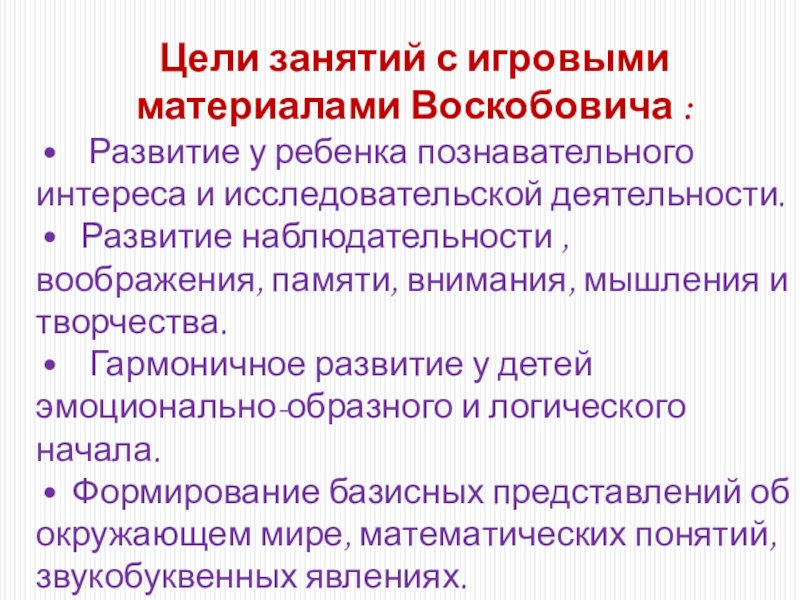 Слайд 8Цели занятий с игровыми материалами Воскобовича :