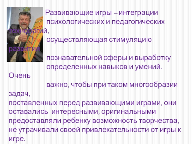 поставленных перед развивающими играми, они оставались интересными, оригинальными предоставляли ребенку возможность творчества, не утрачивали своей привлекательности от игры к игре.