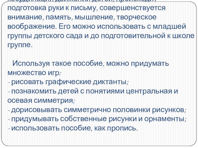 детей, происходит подготовка руки к письму, совершенствуется внимание, память, мышление, творческое воображение. Его можно использовать с младшей группы детского сада и до подготовительной к школе группе.