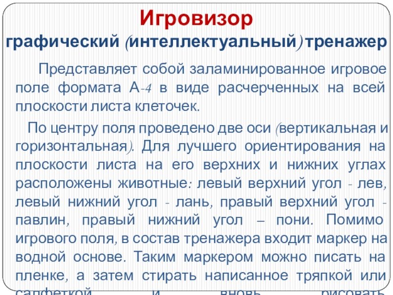 По центру поля проведено две оси (вертикальная и горизонтальная). Для лучшего ориентирования на плоскости листа на его верхних и нижних углах расположены животные: левый верхний угол - лев, левый нижний угол - лань, правый верхний угол - павлин, правый нижний угол – пони. Помимо игрового поля, в состав тренажера входит маркер на водной основе. Таким маркером можно писать на пленке, а затем стирать написанное тряпкой или салфеткой и вновь рисовать.