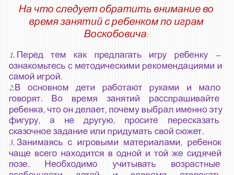 3. Занимаясь с игровыми материалами, ребенок чаще всего находится в одной и той же сидячей позе. Необходимо учитывать возрастные особенности детей и вовремя отвлекать «заигравшихся» от игры.