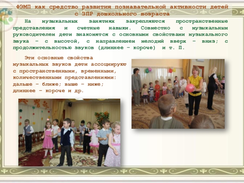Эти основные свойства музыкальных звуков дети ассоциируют с пространственными, временными, количественными представлениями: дальше – ближе; выше – ниже; длиннее – короче и др.