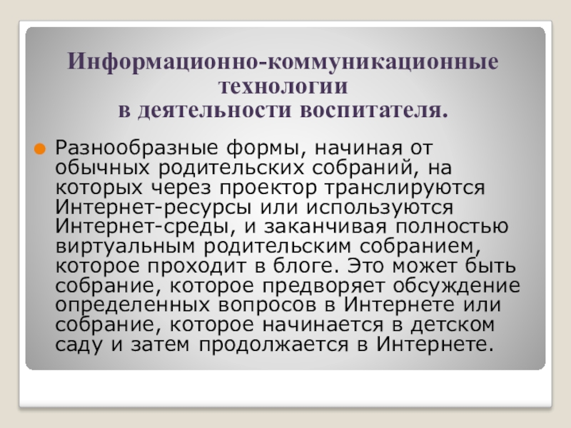 обычных родительских собраний, на которых через проектор транслируются Интернет-ресурсы или используются Интернет-среды, и заканчивая полностью виртуальным родительским собранием, которое проходит в блоге. Это может быть собрание, которое предворяет обсуждение определенных вопросов в Интернете или собрание, которое начинается в детском саду и затем продолжается в Интернете.
