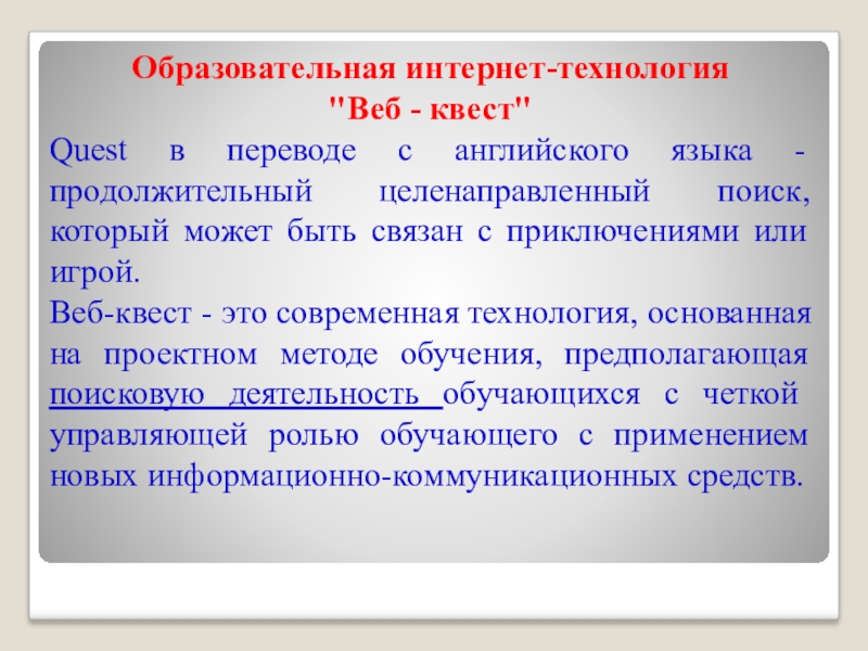 Веб-квест - это современная технология, основанная на проектном методе обучения, предполагающая поисковую деятельность обучающихся с четкой управляющей ролью обучающего с применением новых информационно-коммуникационных средств.