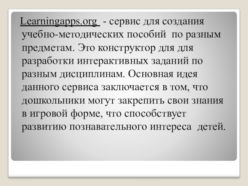 предметам. Это конструктор для для разработки интерактивных заданий по разным дисциплинам. Основная идея данного сервиса заключается в том, что дошкольники могут закрепить свои знания в игровой форме, что способствует развитию познавательного интереса детей.