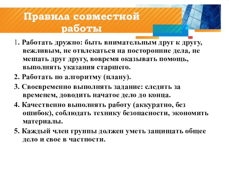 Слайд 91. Работать дружно: быть внимательным друг к другу, вежливым, не отвлекаться