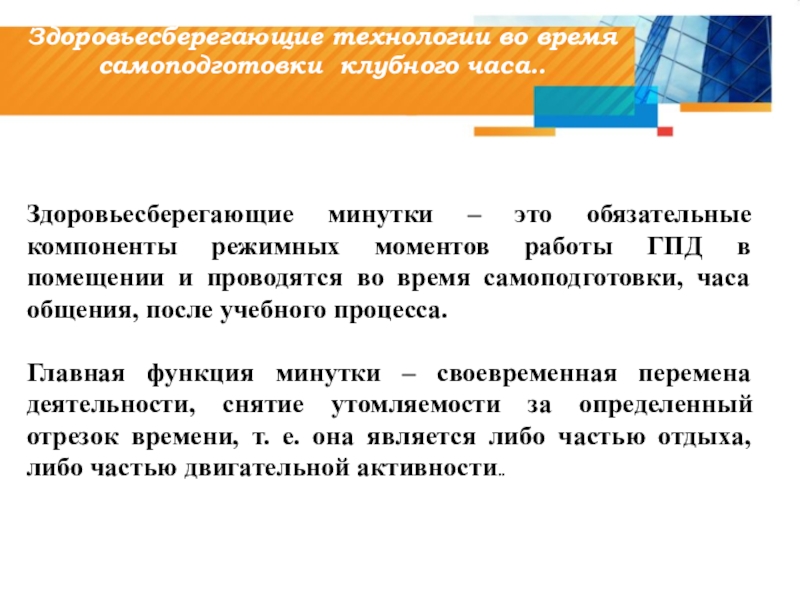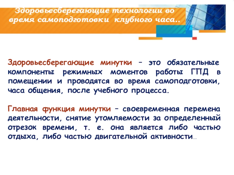 Слайд 16Здоровьесберегающие технологии во время самоподготовки клубного часа..