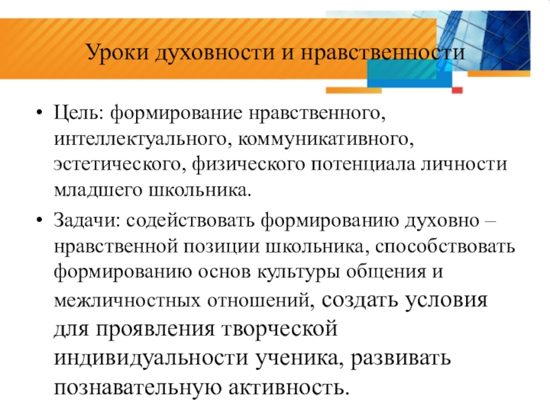 Задачи: содействовать формированию духовно – нравственной позиции школьника, способствовать формированию основ культуры общения и межличностных отношений, создать условия для проявления творческой индивидуальности ученика, развивать познавательную активность.
