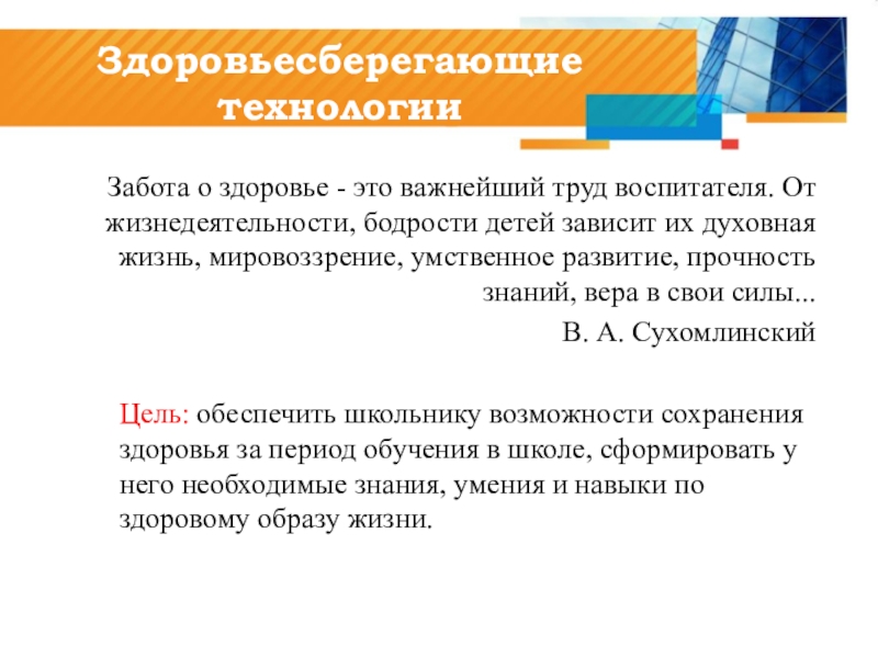 Цель: обеспечить школьнику возможности сохранения здоровья за период обучения в школе, сформировать у него необходимые знания, умения и навыки по здоровому образу жизни.