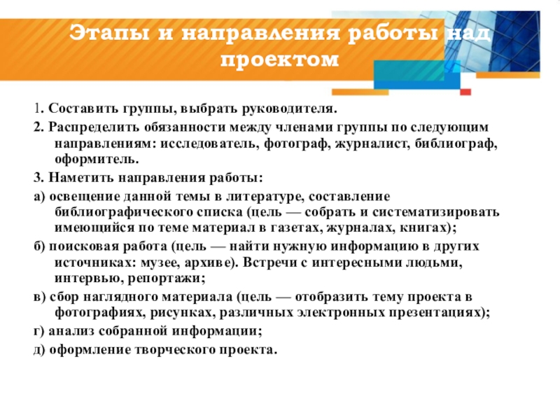 обязанности между членами группы по следующим направлениям: исследователь, фотограф, журналист, библиограф, оформитель.