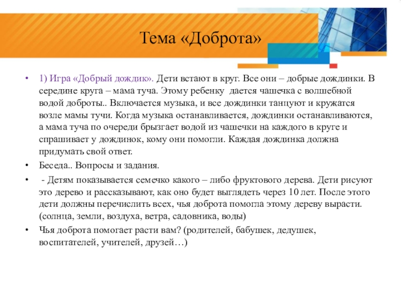 1) Игра «Добрый дождик». Дети встают в круг. Все они