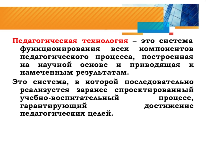 Слайд 3Педагогическая технология – это система функционирования всех компонентов педагогического процесса, построенная
