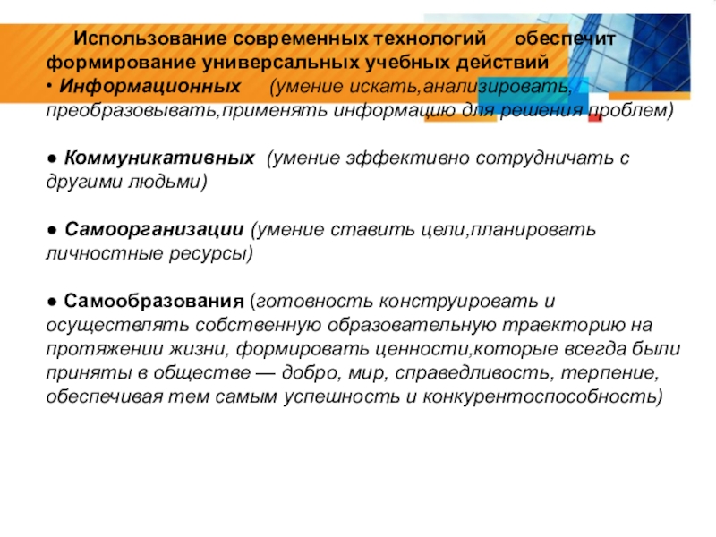 Слайд 4 Использование современных технологий обеспечит формирование универсальных