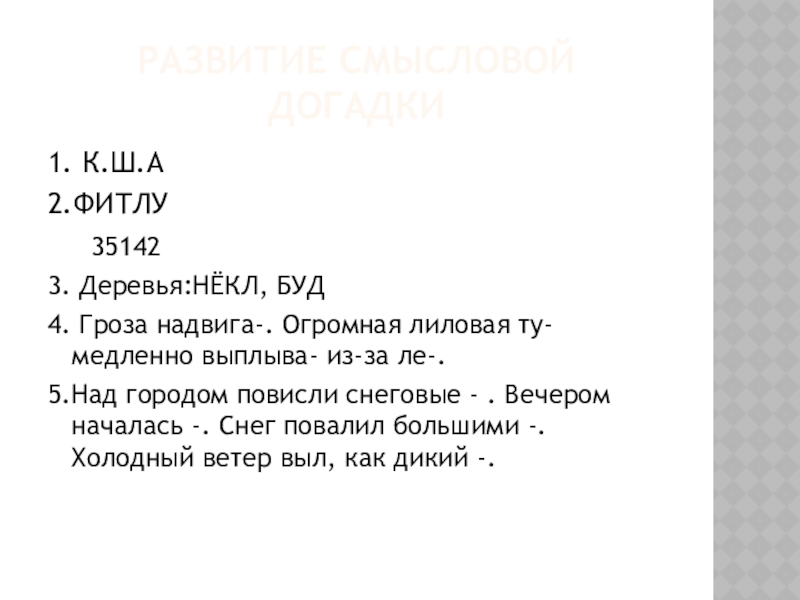 Развитие смысловой догадки1. К.Ш.А           2.ФИТЛУ