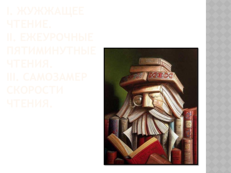 Слайд 2I. Жужжащее чтение. II. Ежеурочные пятиминутные чтения. III. Самозамер скорости чтения.