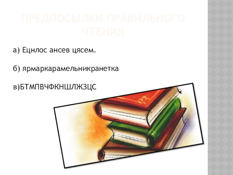 Предпосылки правильного чтенияа) Ецнлос ансев цясем.б) ярмаркарамельникранеткав)БТМПВЧФКНШЛЖЗЦС