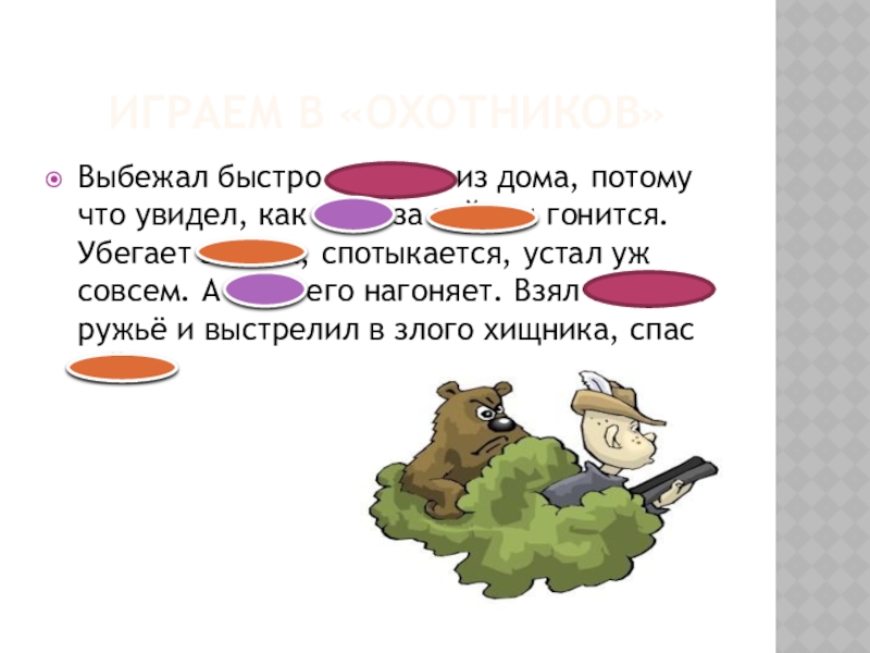 Играем в «охотников»Выбежал быстро охотник из дома, потому что увидел, как волк за зайцем гонится. Убегает зайчик,