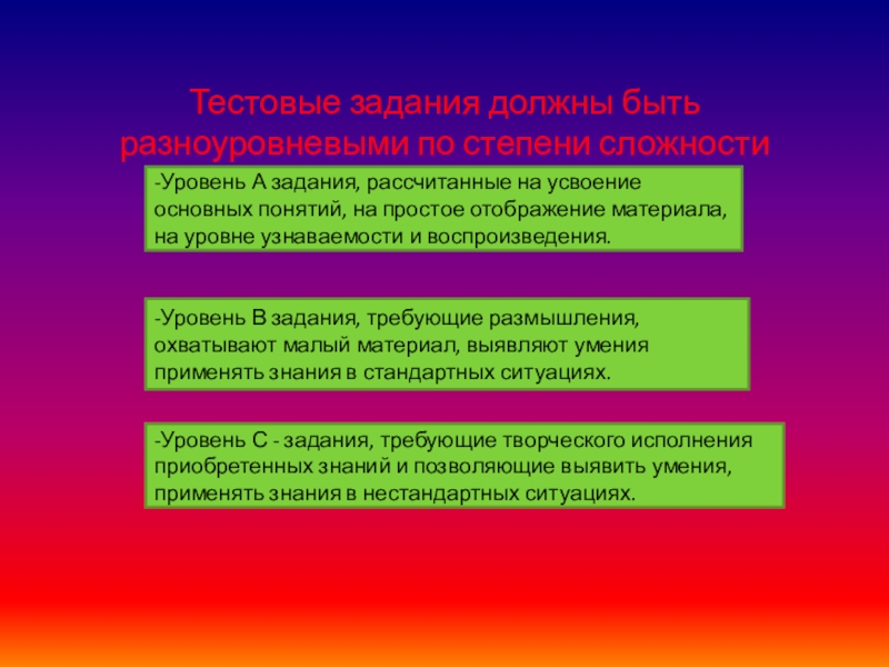-Уровень В задания, требующие размышления, охватывают малый материал, выявляют умения применять знания в стандартных ситуациях.