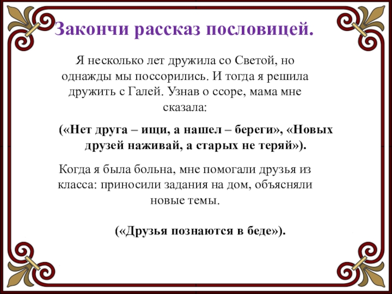 («Нет друга – ищи, а нашел – береги», «Новых друзей наживай, а старых не теряй»).